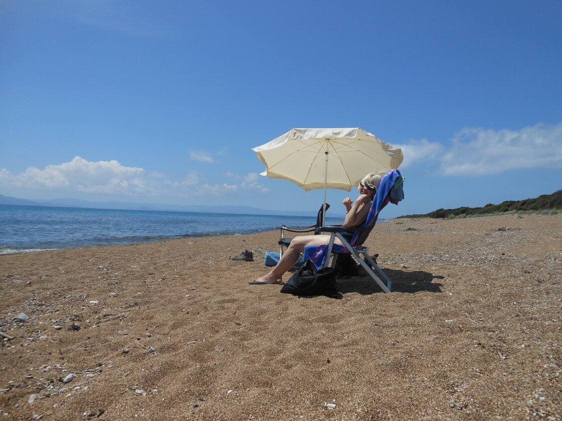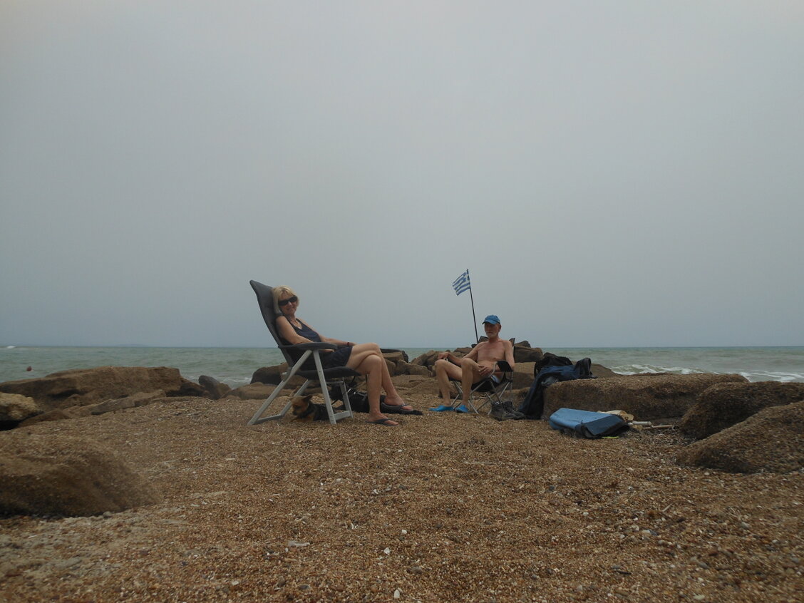 De camping was echt Grieks met veel vaste plekken en een smal strand vol met ligbedden.