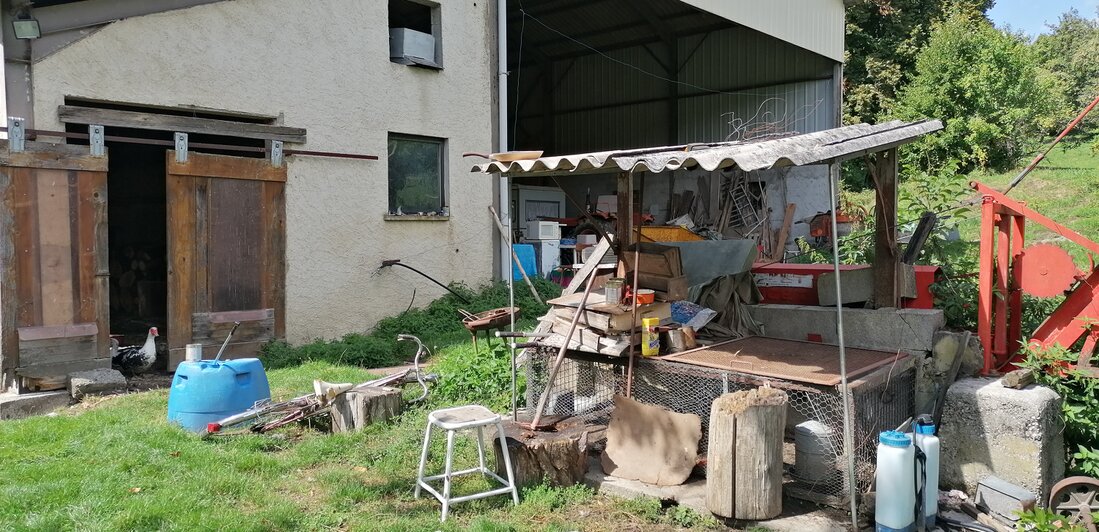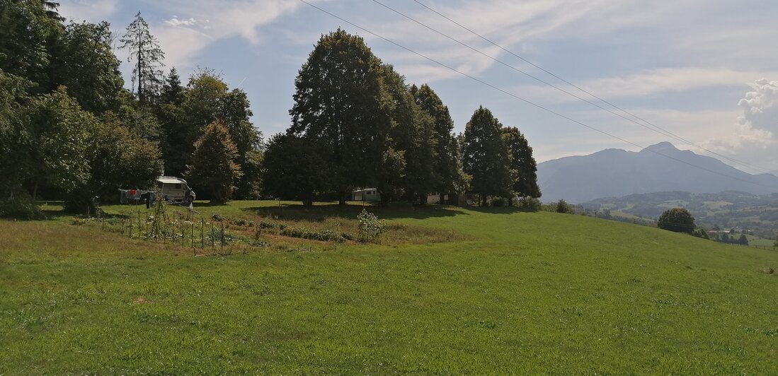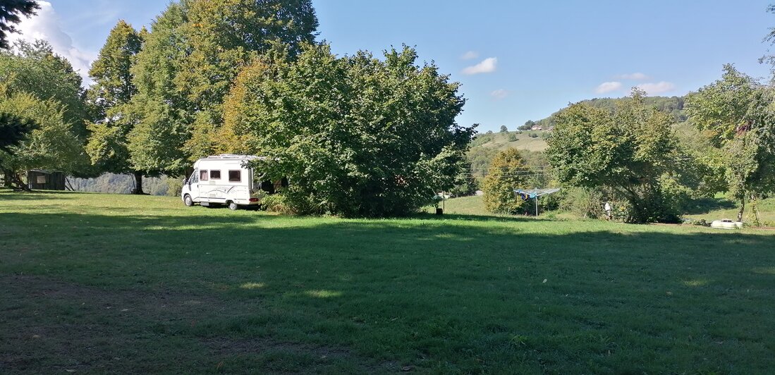 Ferme du Bois de la Teppe. Een rommeltje bij de boerderij maar de minicamping is geweldig mooi gelegen.