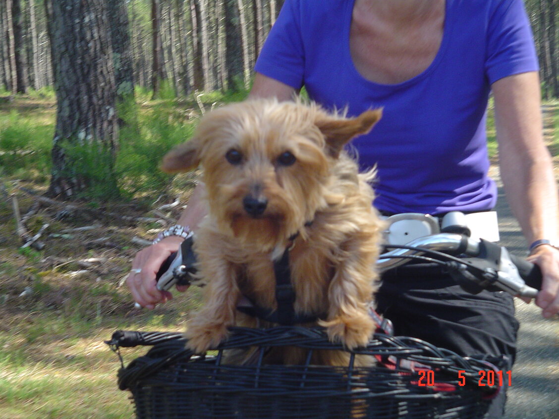 Tibi is niet te handhaven in het fietsmandje. Ze heeft er genoeg van. André ook.