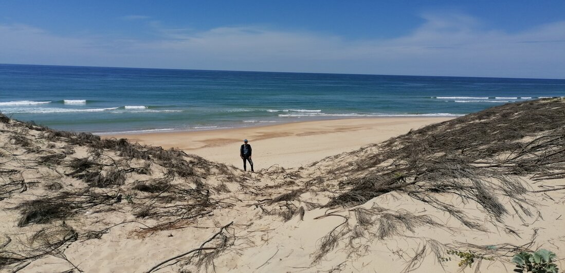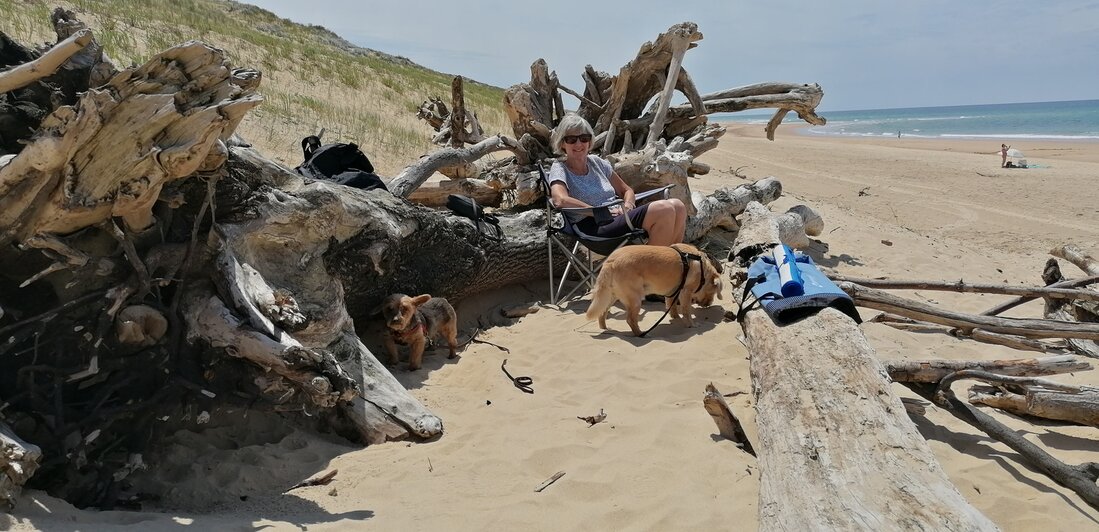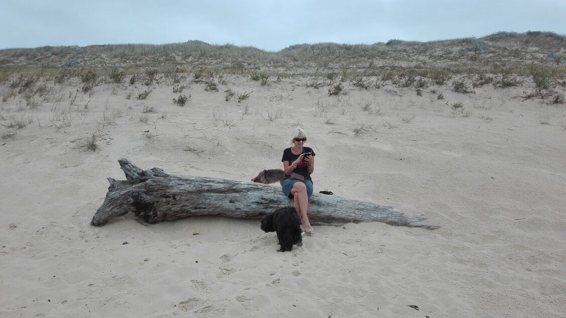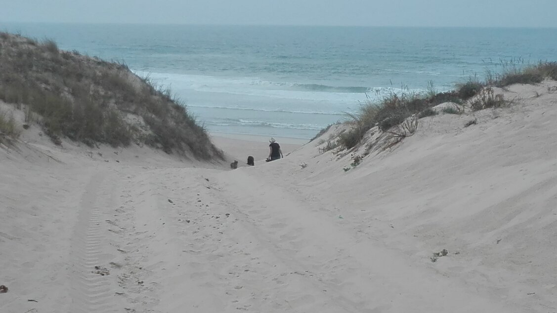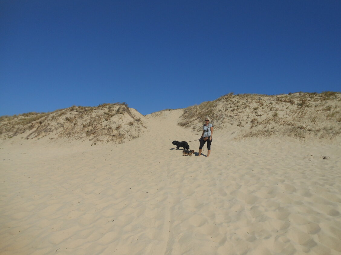 Alle dagen strandweer, dus zeulen door het bos en de duinen naar het strand.