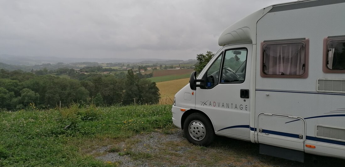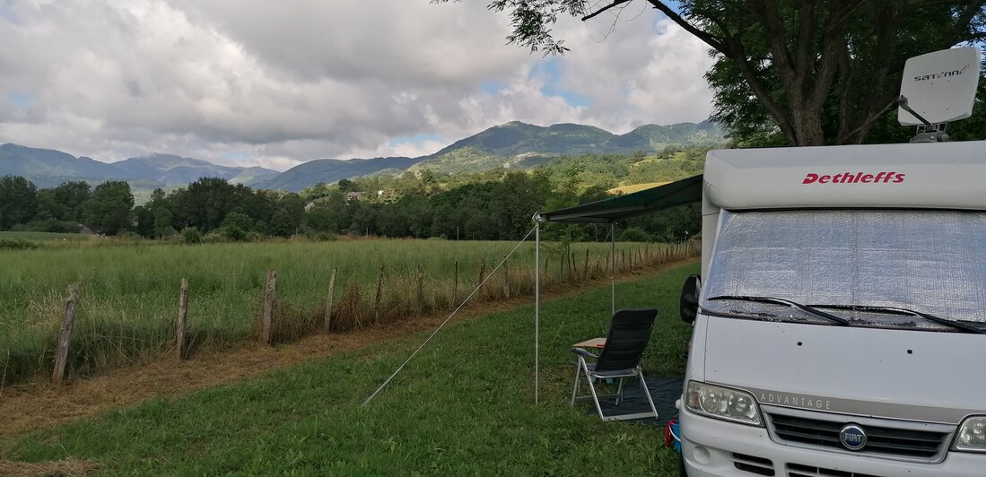Eerst boodschappen doen in Dax en dan naar CP Orriule voor de picknick. Mooi uitzicht maar wel in de miezer.