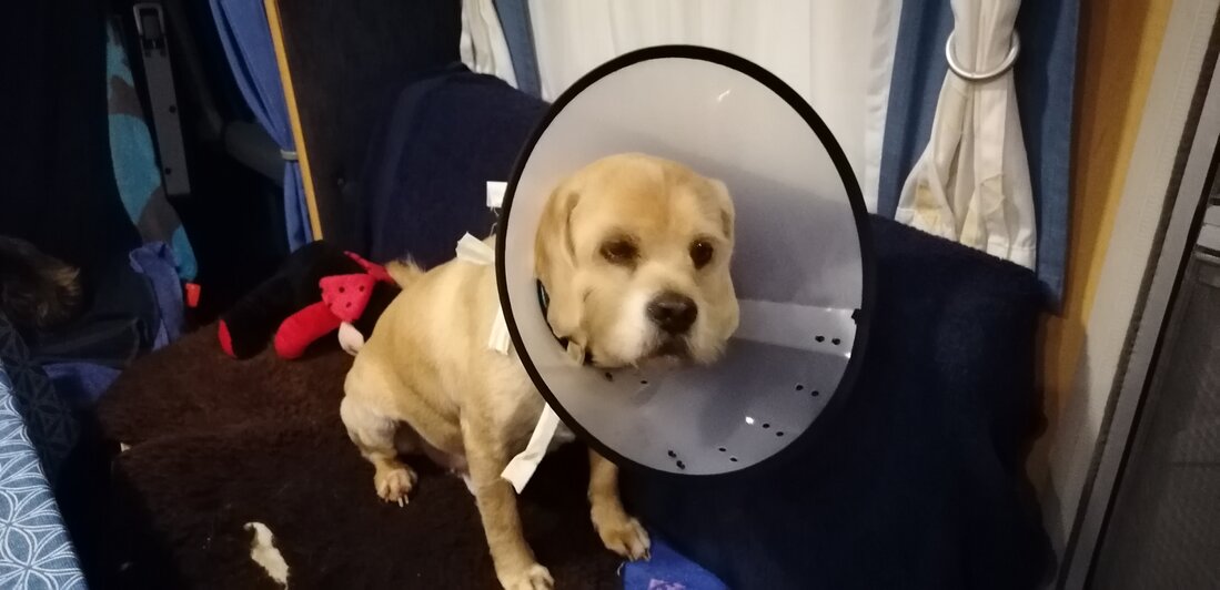 Eerst nog naar Tubergen voor controle van Chico en een kraag om het krabben te beletten.