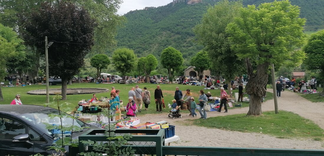 Luierdag op de camping aan de Dourbie. Boodschappen in Nant en in een stortbui weer naar de camping.