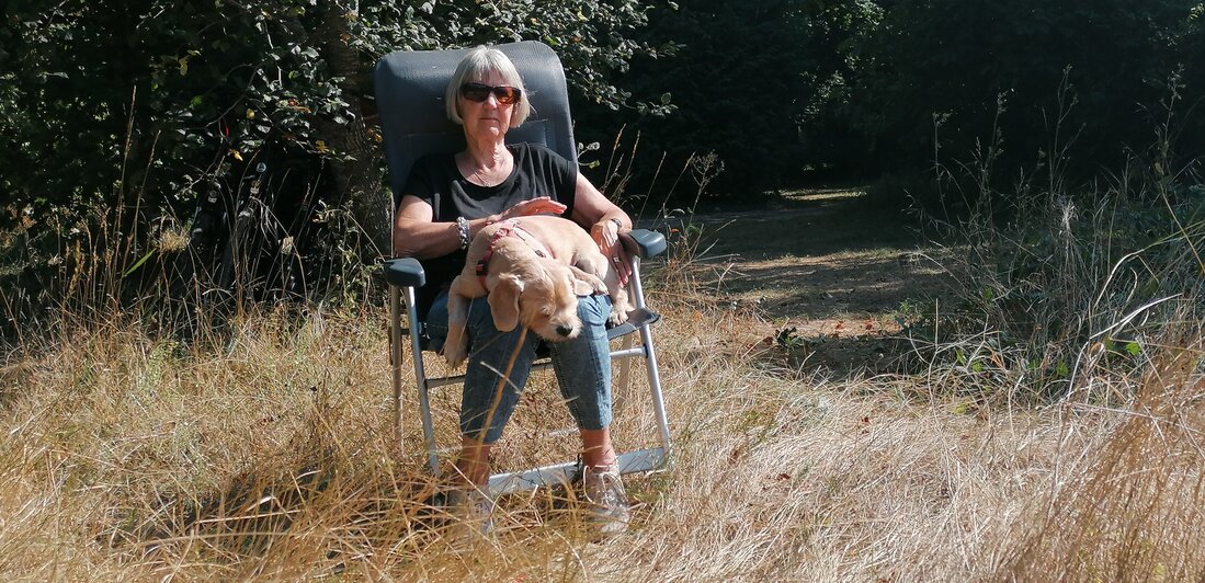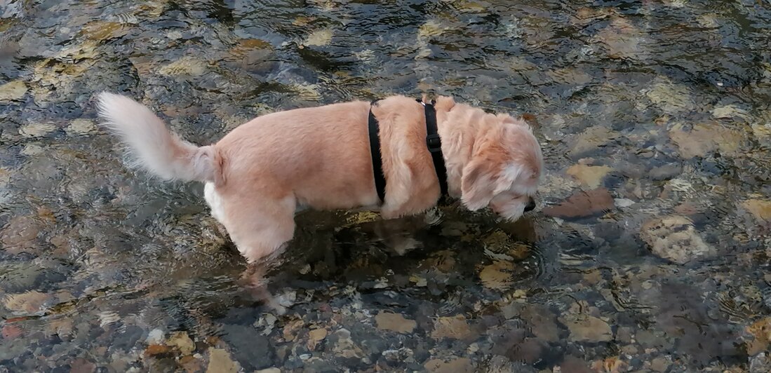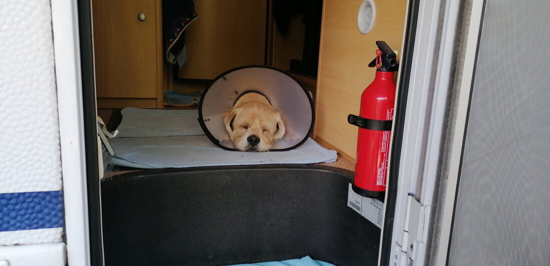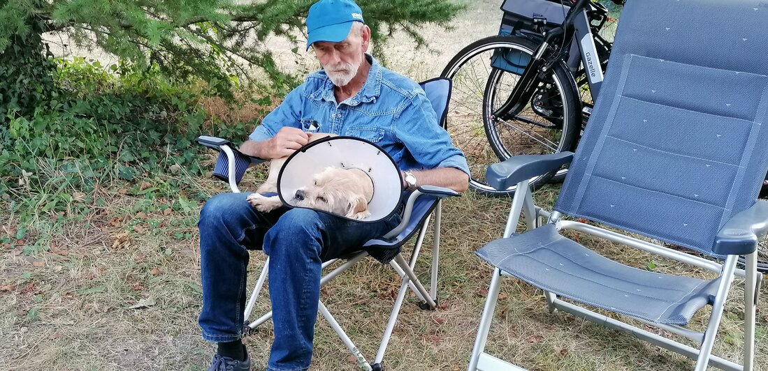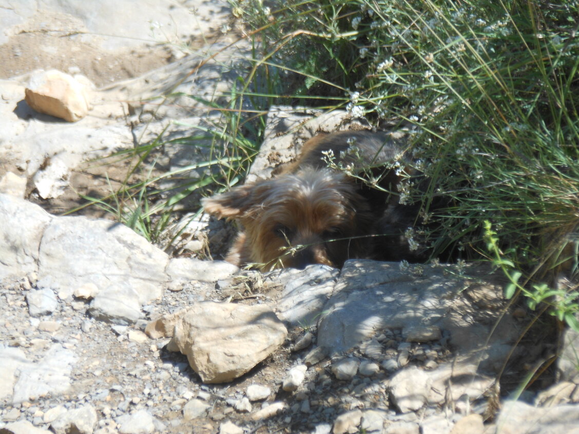 Wandeling omhoog viel niet mee. Chico vandaag zonder kraag.